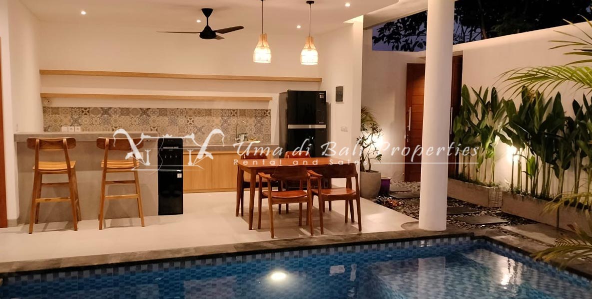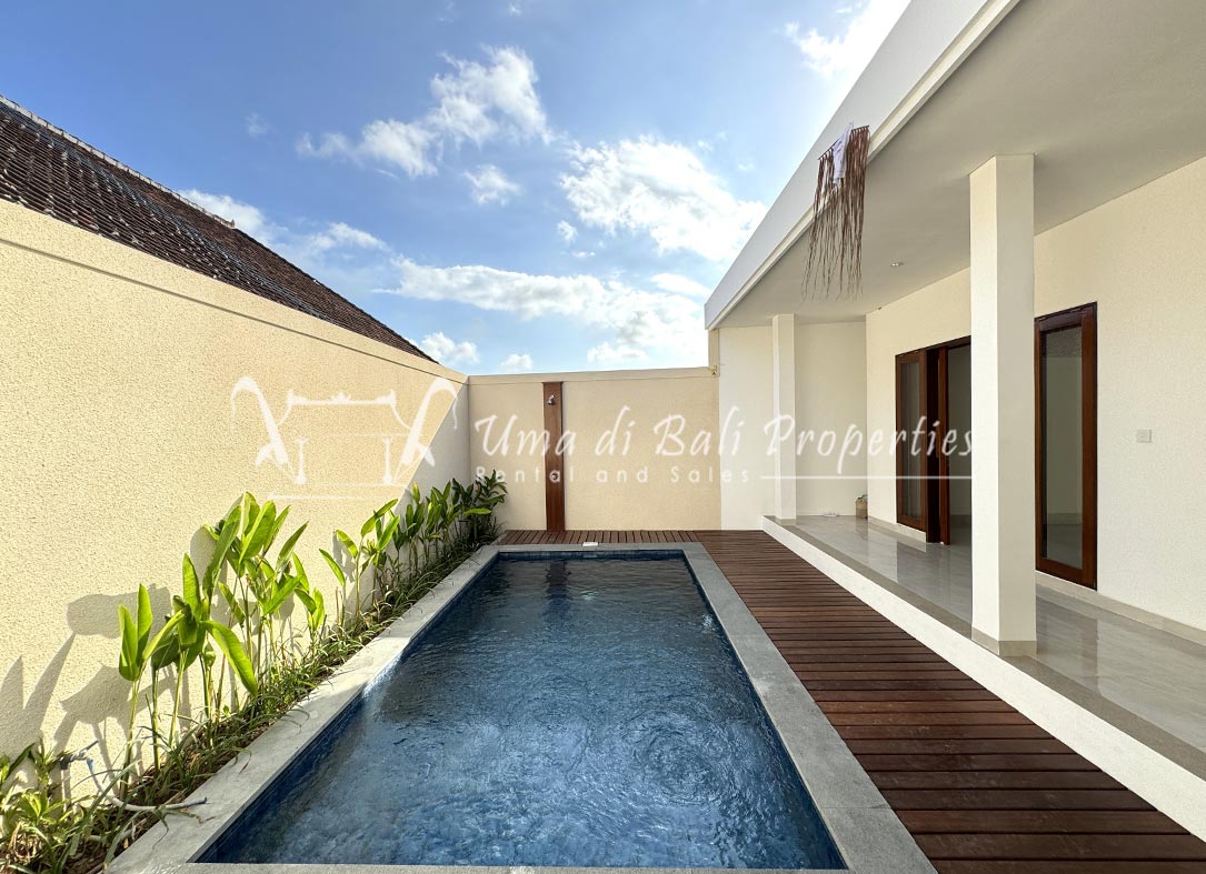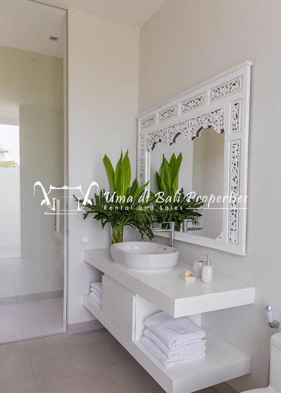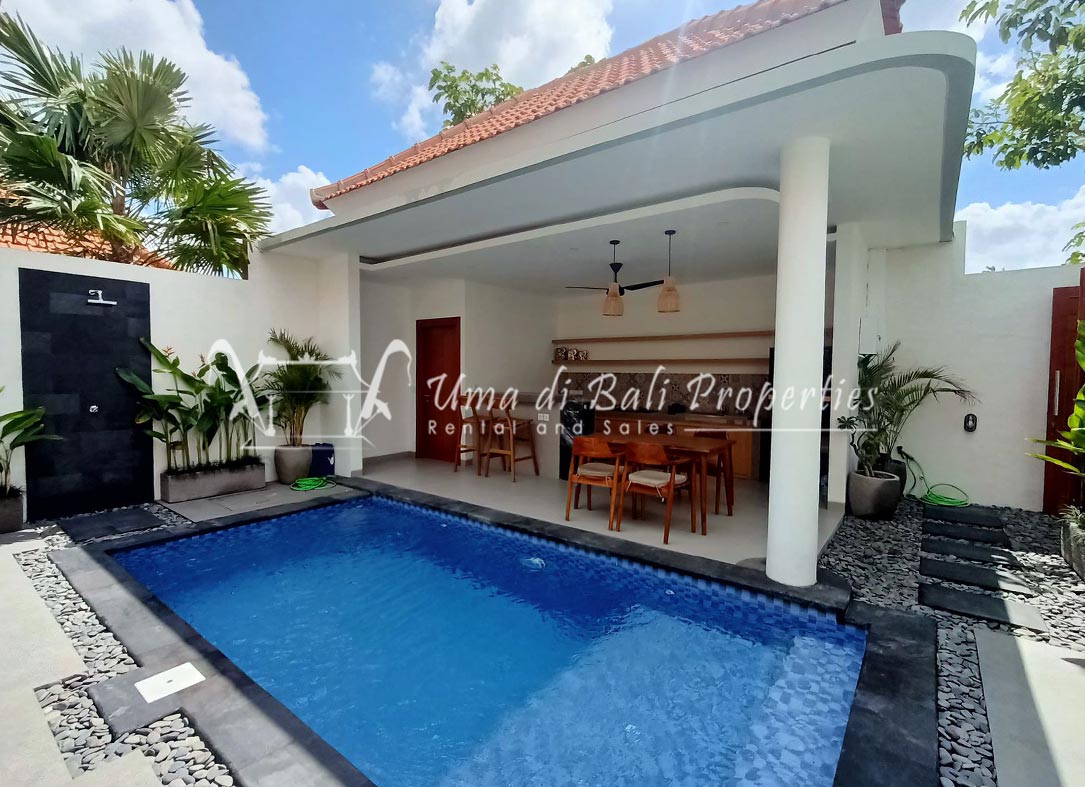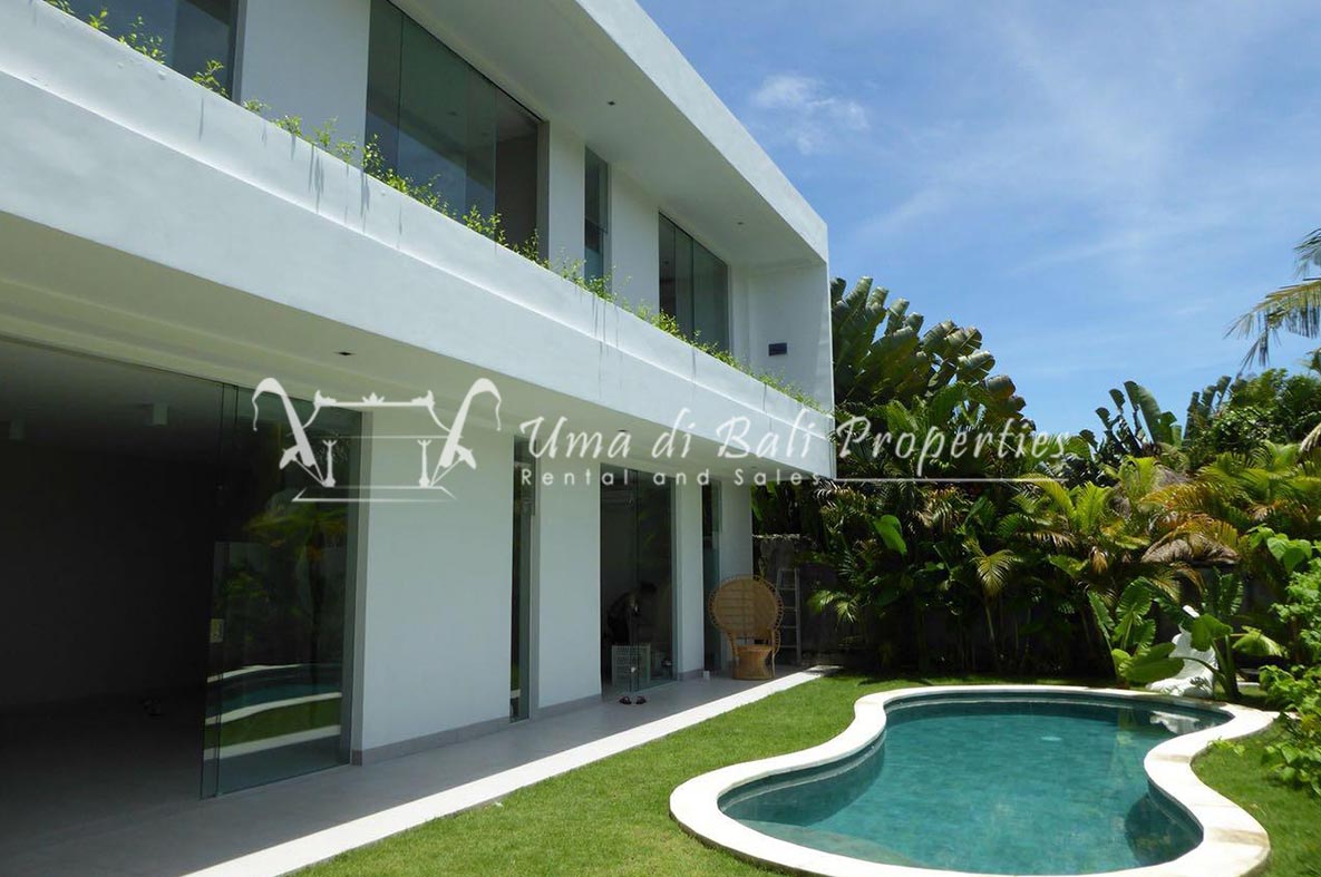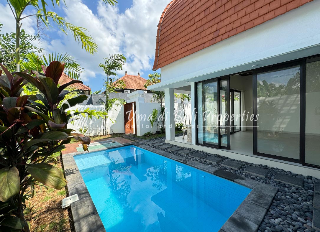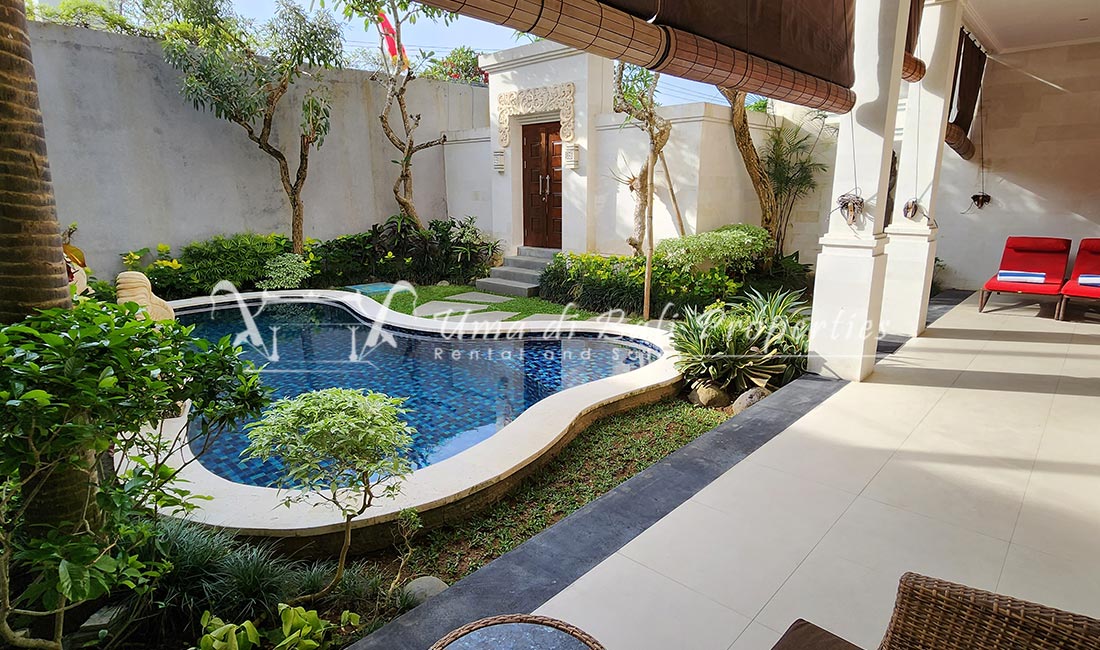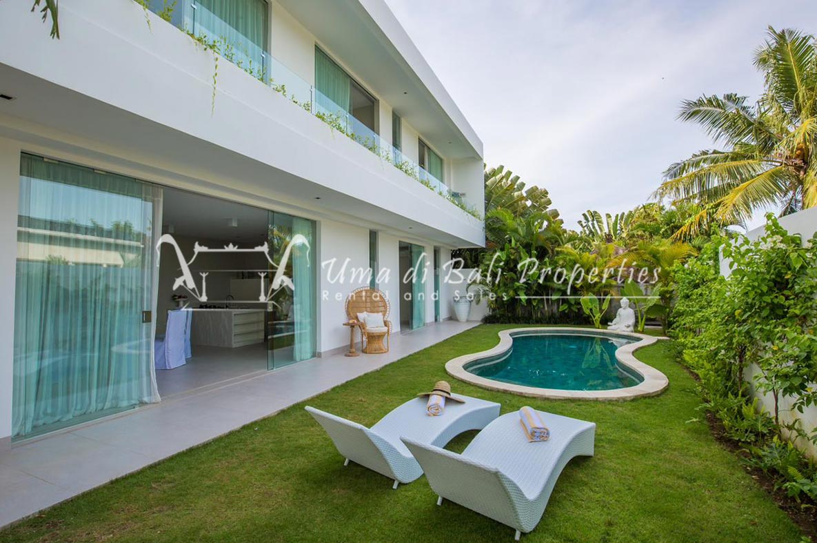 Stunning 3-bedroom long term rental Villa in Umalas area. This yearly rental villa is a modern home, complete with garden, swimming pool and various tropical plants. The landsize of this beautiful Long Term Rental Villa is 300 m2. There is a fully equipped kitchen with all the modern conveniences; the formal dining area; the cozy TV area and the cozy enclosed living room area. The villa contains 3 bedrooms and each bedroom has its own en suite bathroom and shower. The terrace gives a nice view on the swimming pool with sun deck.