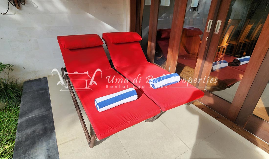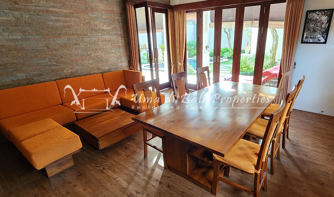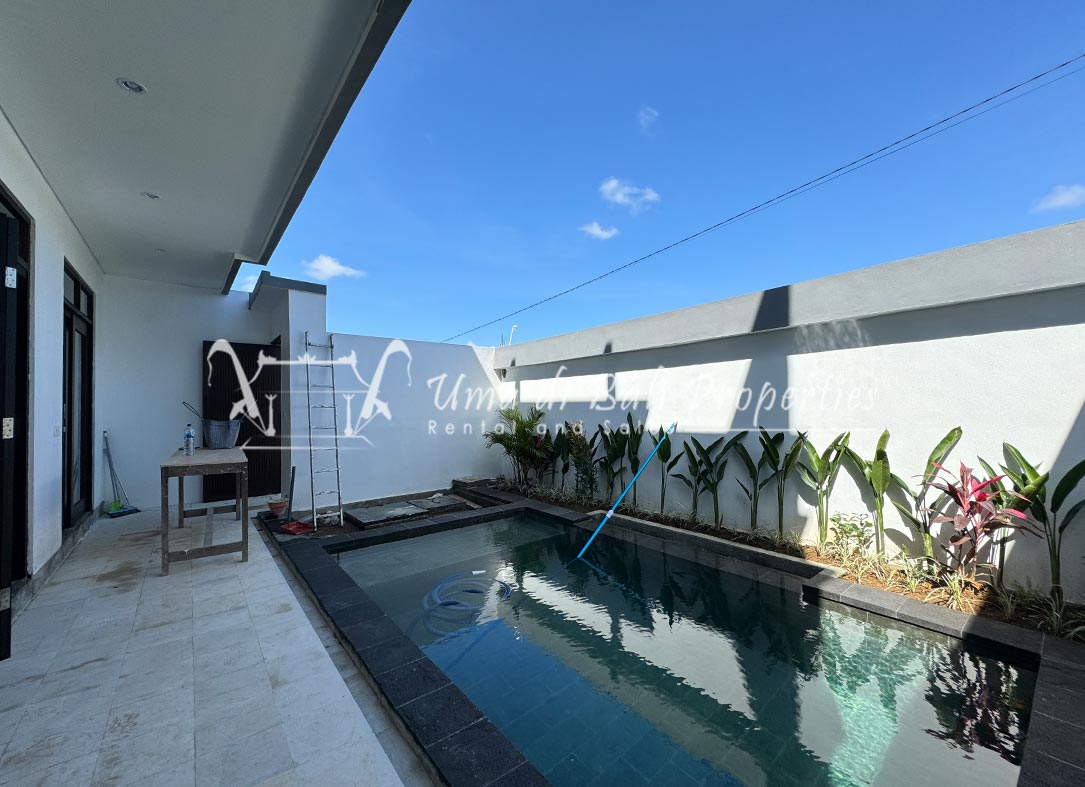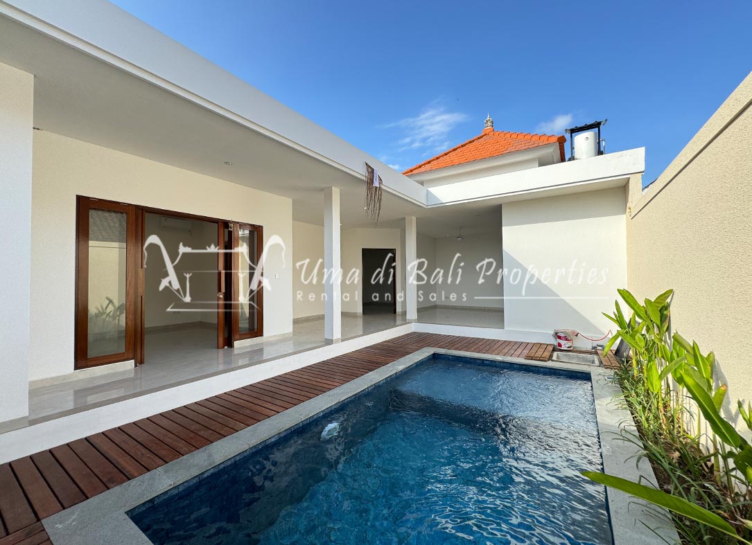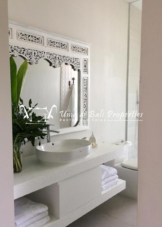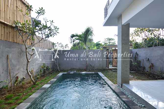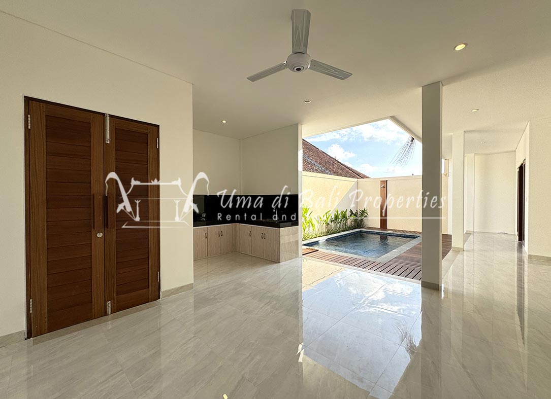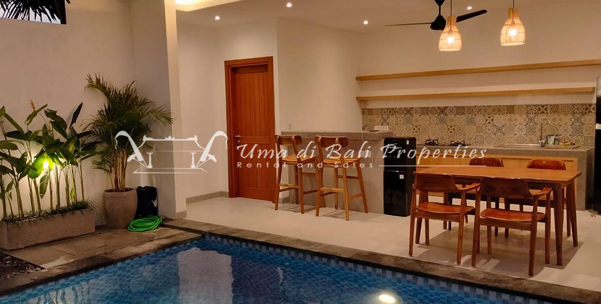 Stunning 3-bedroom long term rental Villa in Umalas area. This yearly rental villa is a modern home, complete with garden, swimming pool and various tropical plants. The landsize of this beautiful Long Term Rental Villa is 300 m2. There is a fully equipped kitchen with all the modern conveniences; the formal dining area; the cozy TV area and the cozy enclosed living room area. The villa contains 3 bedrooms and each bedroom has its own en suite bathroom and shower. The terrace gives a nice view on the swimming pool with sun deck.