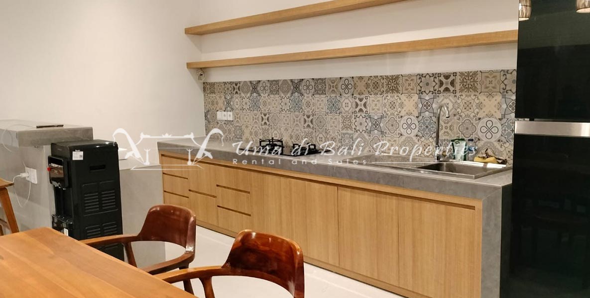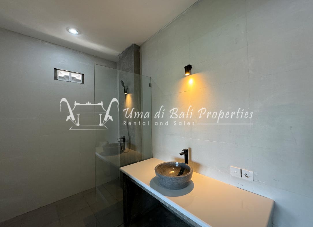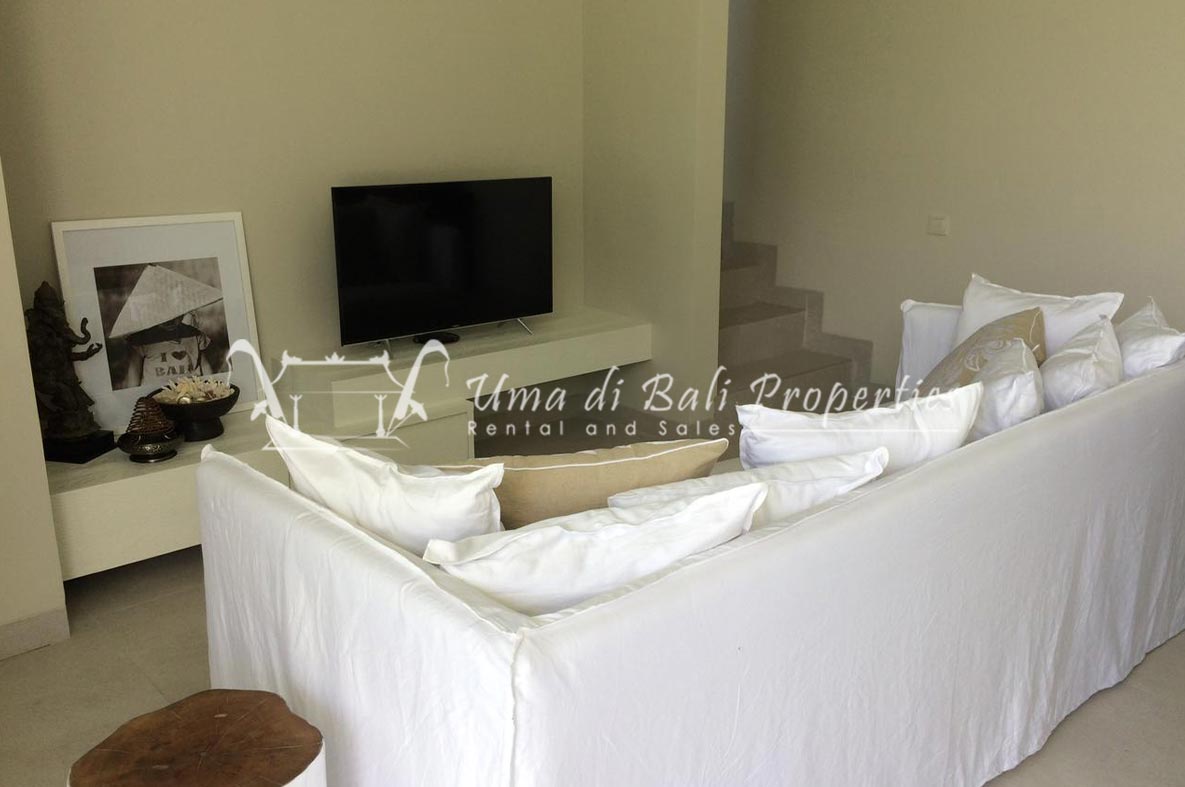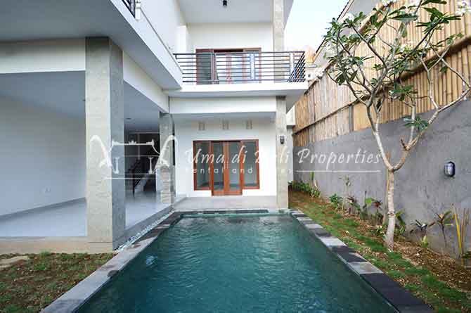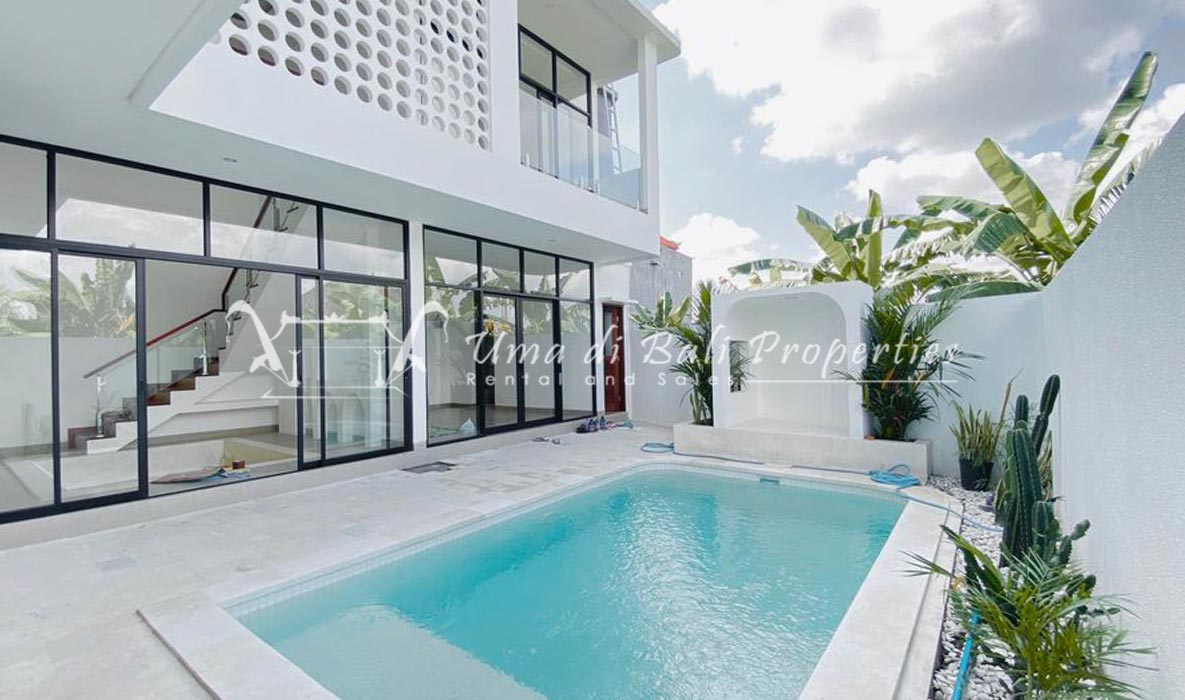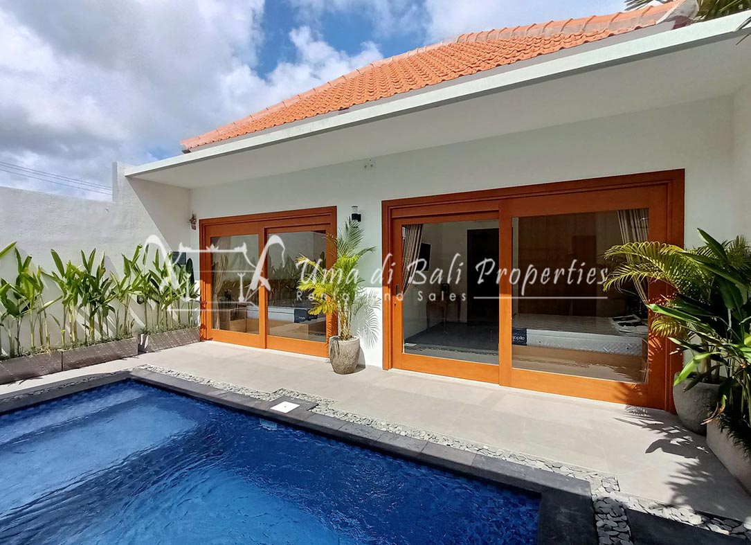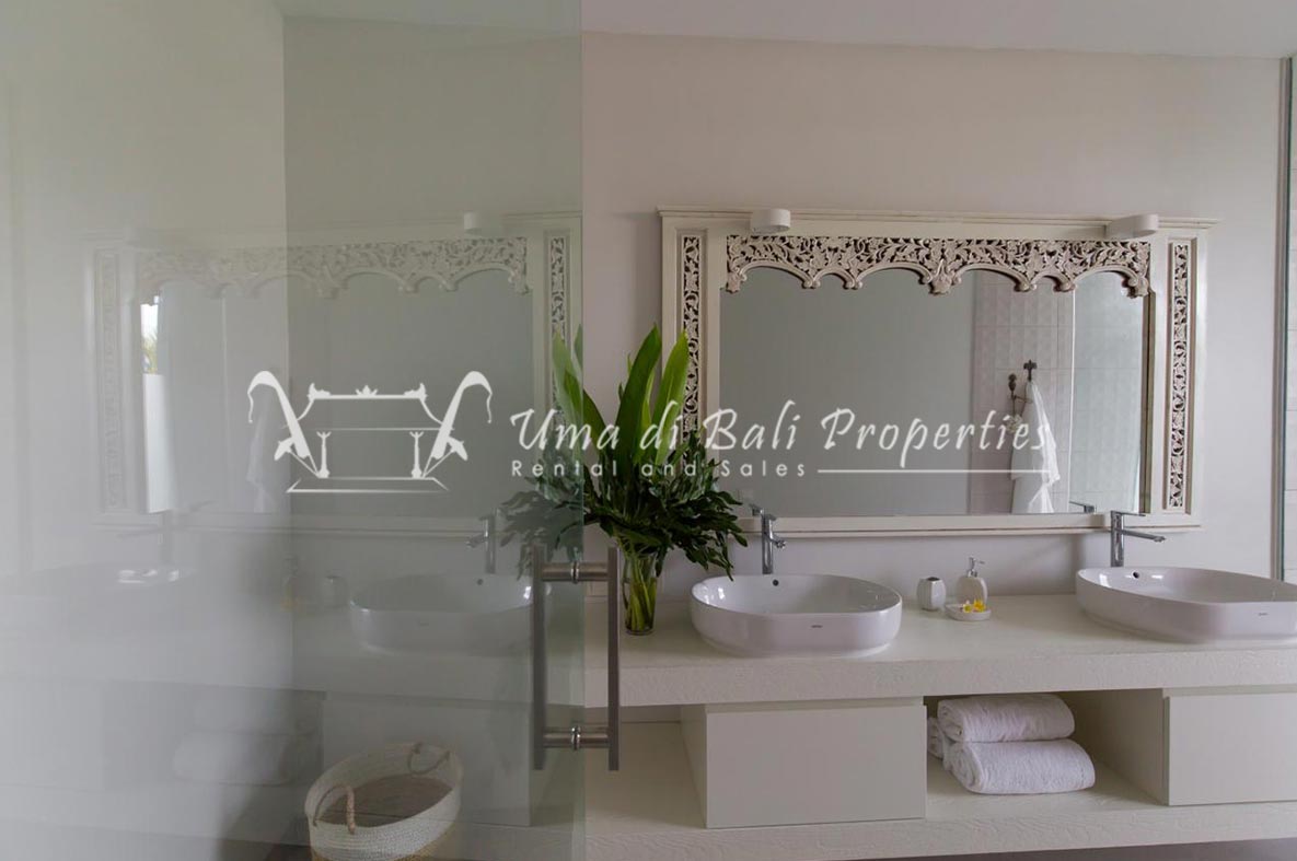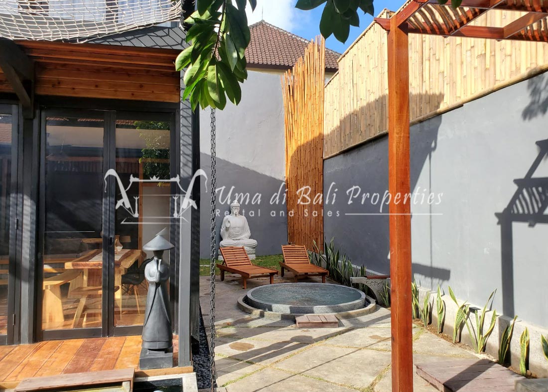 Stunning 3-bedroom long term rental Villa in Umalas area. This yearly rental villa is a modern home, complete with garden, swimming pool and various tropical plants. The landsize of this beautiful Long Term Rental Villa is 300 m2. There is a fully equipped kitchen with all the modern conveniences; the formal dining area; the cozy TV area and the cozy enclosed living room area. The villa contains 3 bedrooms and each bedroom has its own en suite bathroom and shower. The terrace gives a nice view on the swimming pool with sun deck.