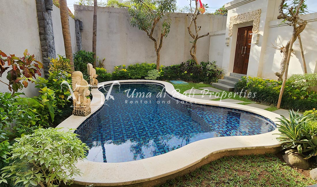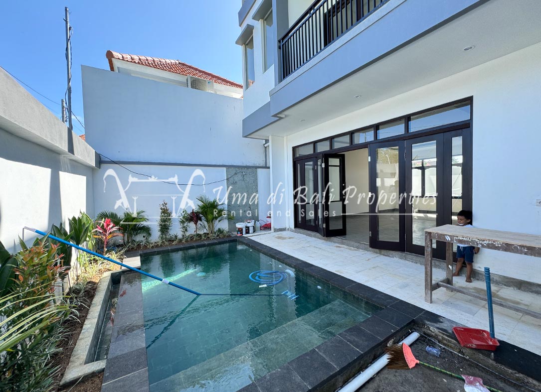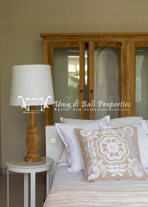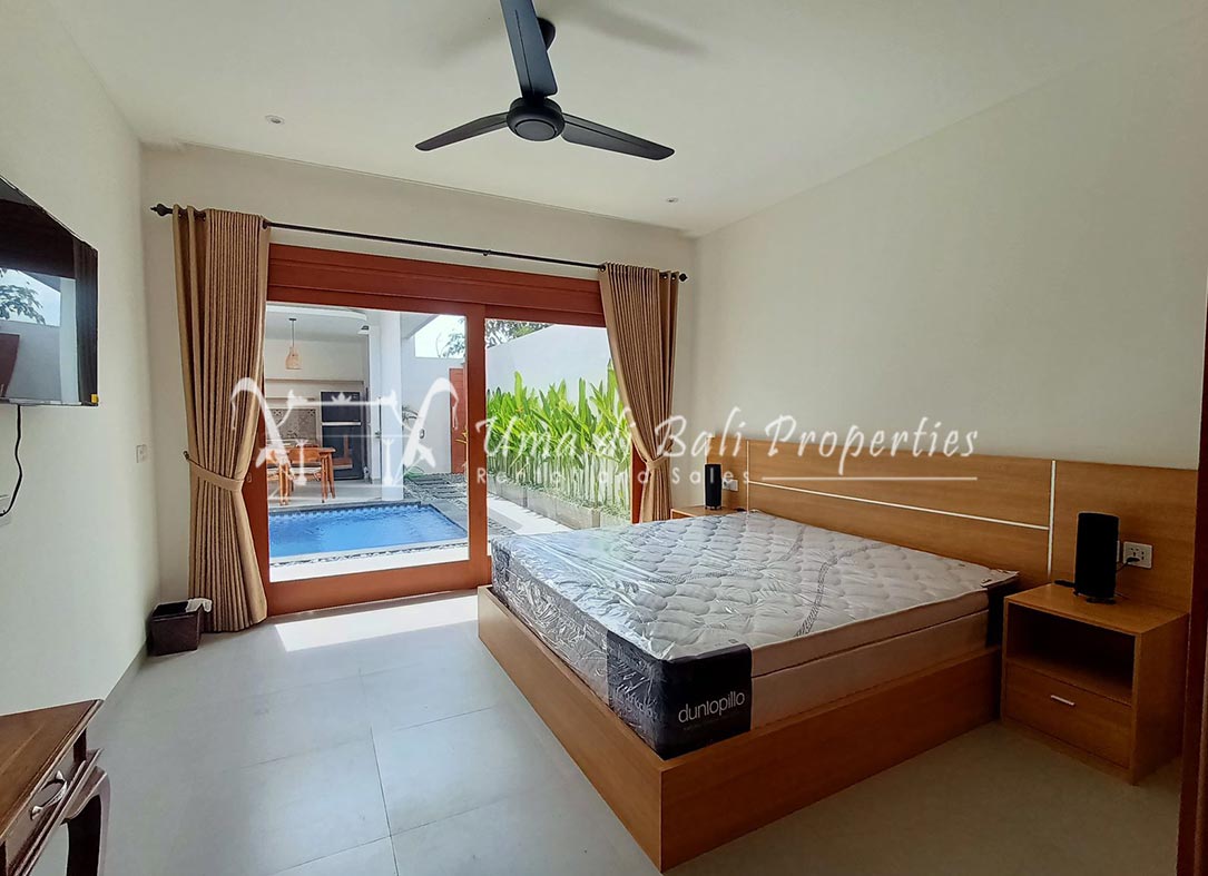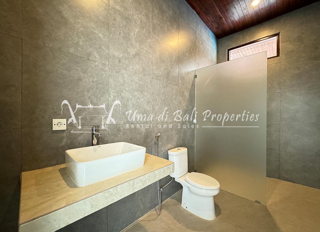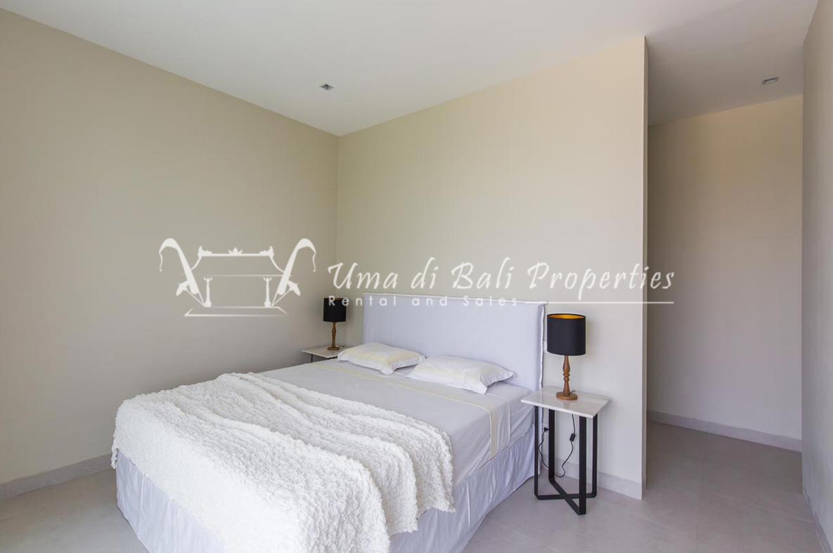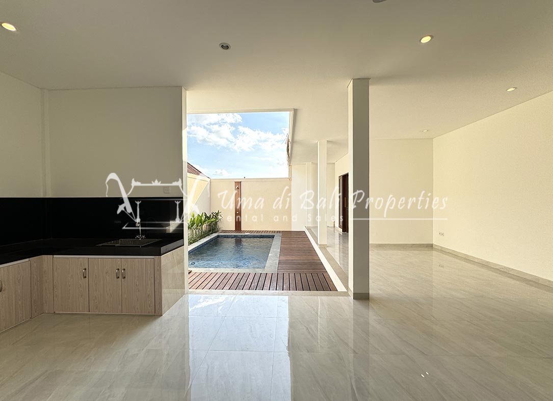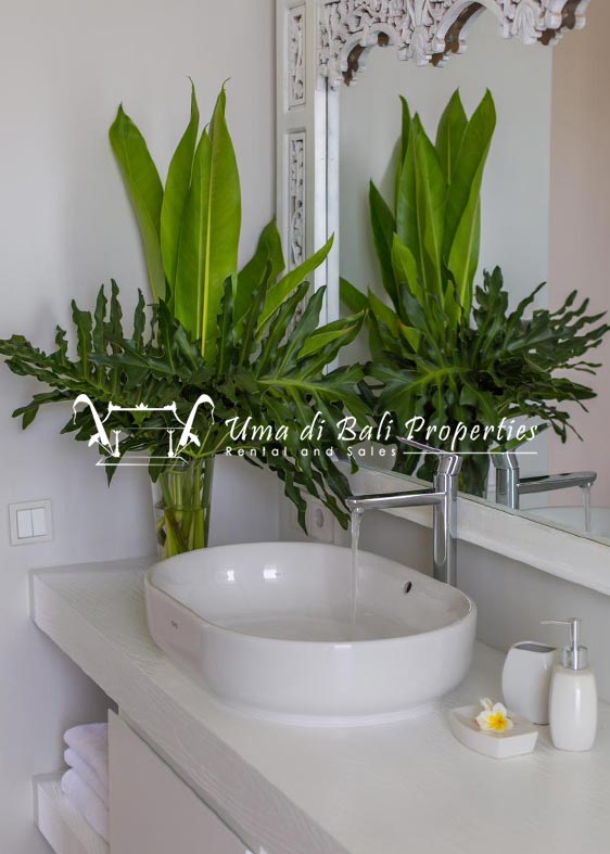 Stunning 3-bedroom long term rental Villa in Umalas area. This yearly rental villa is a modern home, complete with garden, swimming pool and various tropical plants. The landsize of this beautiful Long Term Rental Villa is 300 m2. There is a fully equipped kitchen with all the modern conveniences; the formal dining area; the cozy TV area and the cozy enclosed living room area. The villa contains 3 bedrooms and each bedroom has its own en suite bathroom and shower. The terrace gives a nice view on the swimming pool with sun deck.