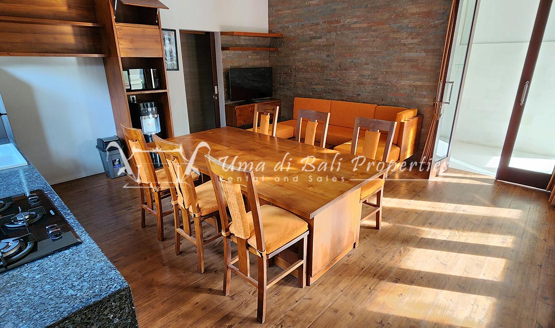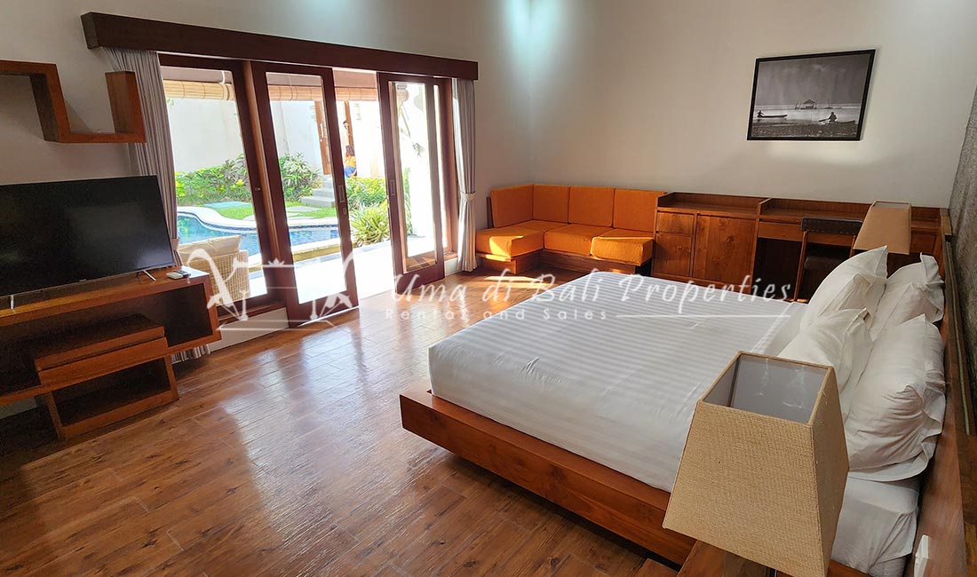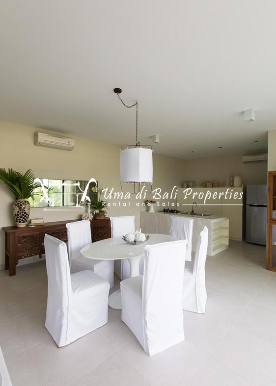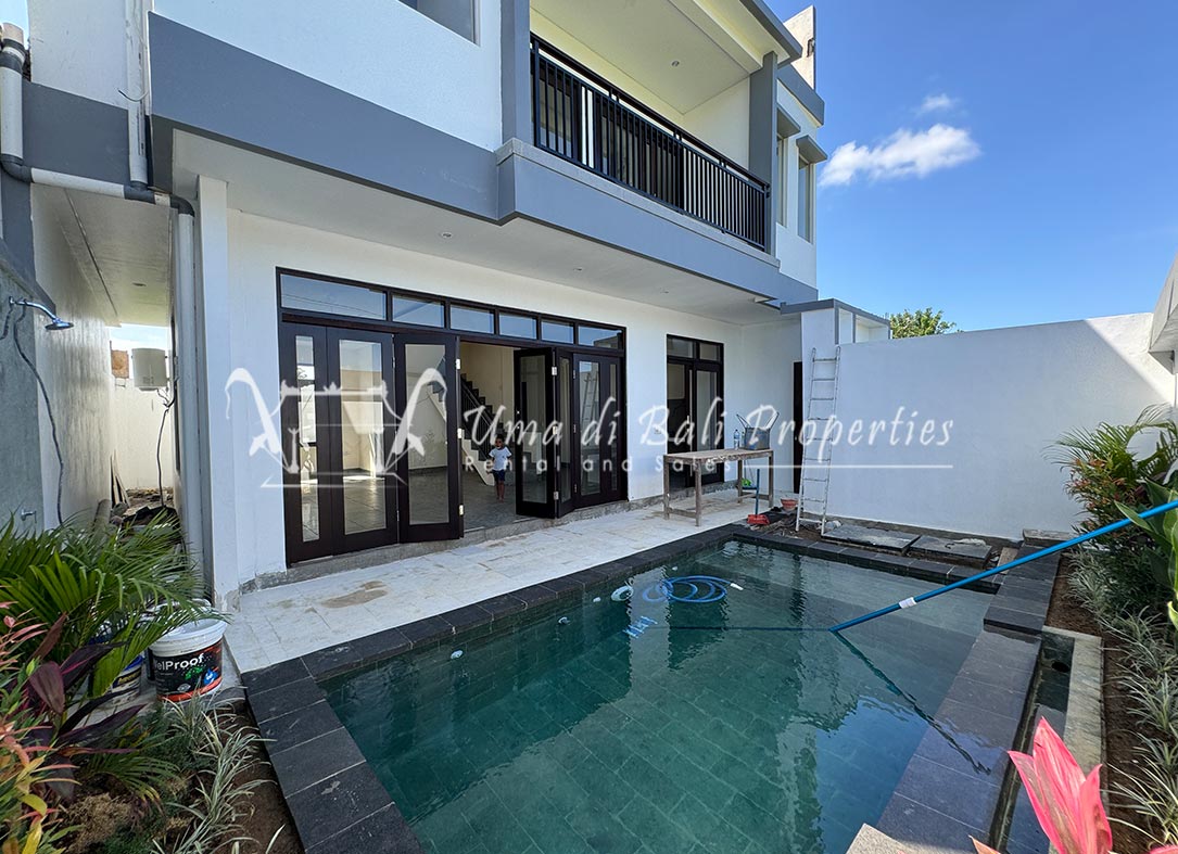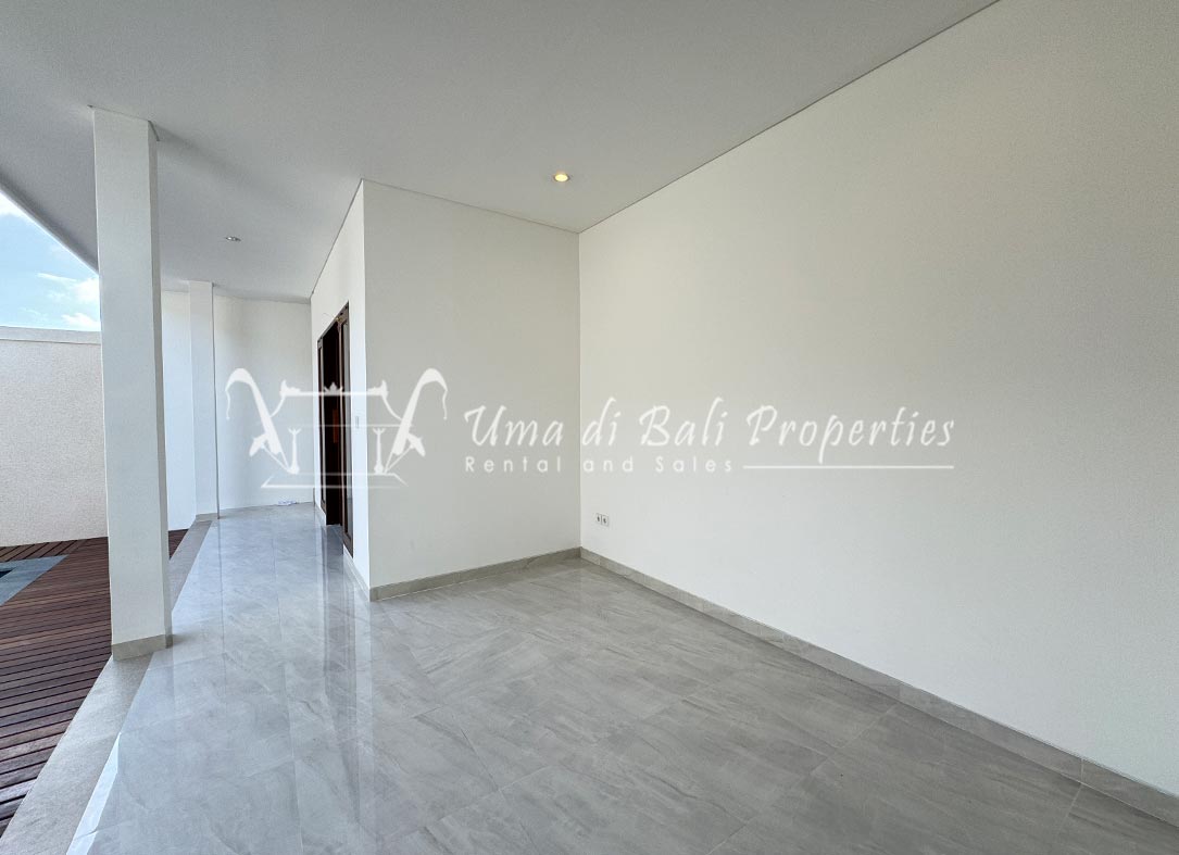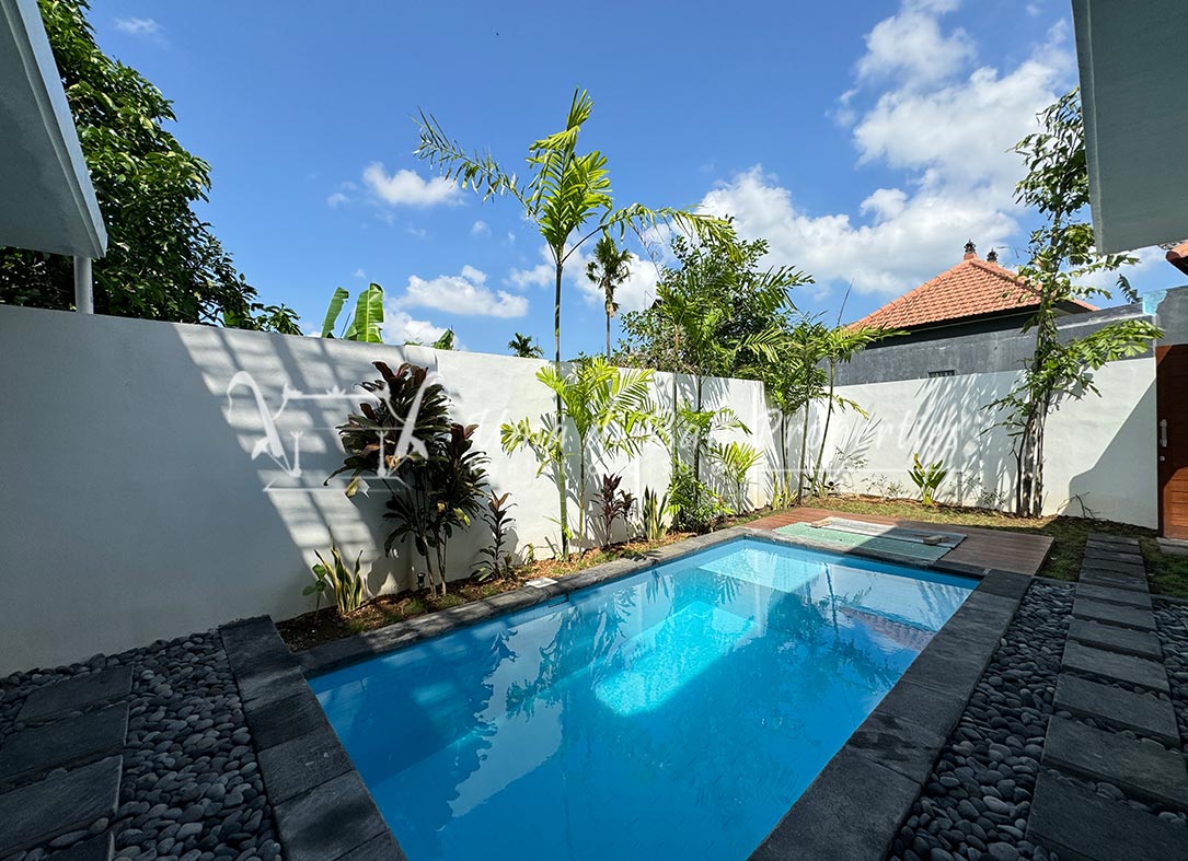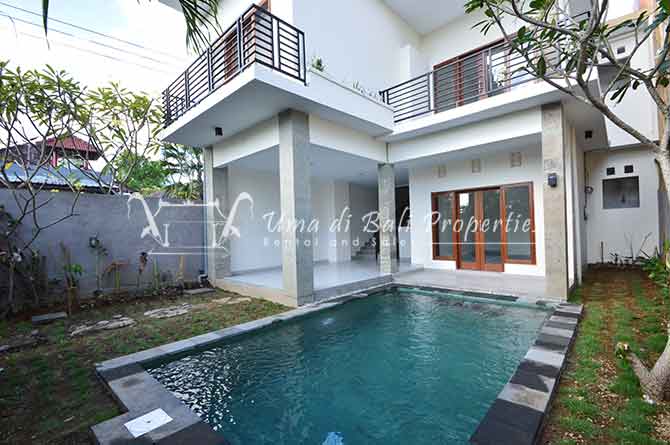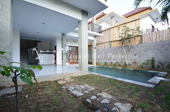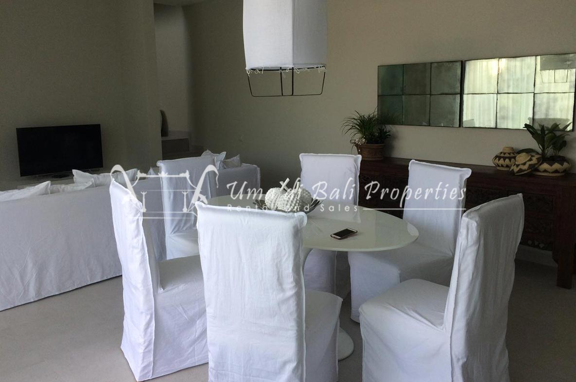 Stunning 3-bedroom long term rental Villa in Umalas area. This yearly rental villa is a modern home, complete with garden, swimming pool and various tropical plants. The landsize of this beautiful Long Term Rental Villa is 300 m2. There is a fully equipped kitchen with all the modern conveniences; the formal dining area; the cozy TV area and the cozy enclosed living room area. The villa contains 3 bedrooms and each bedroom has its own en suite bathroom and shower. The terrace gives a nice view on the swimming pool with sun deck.
