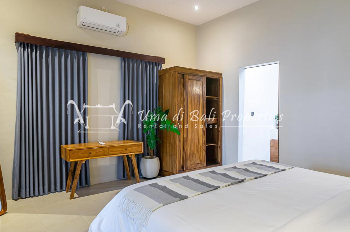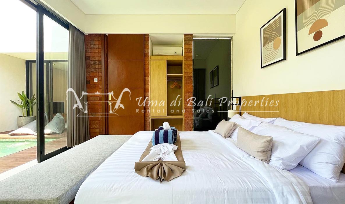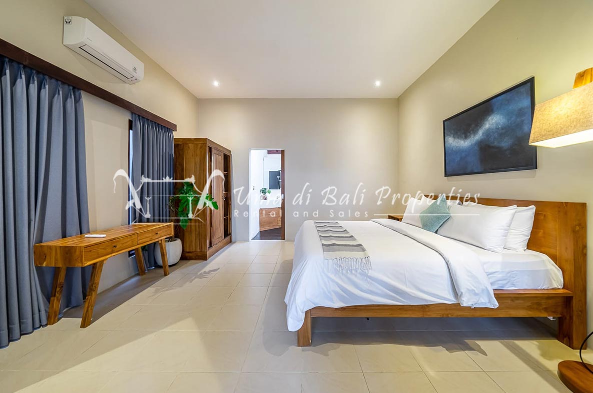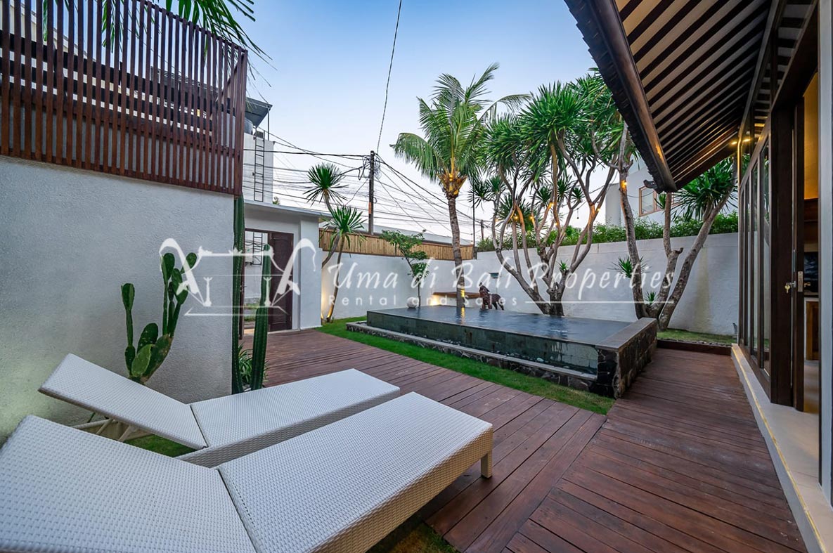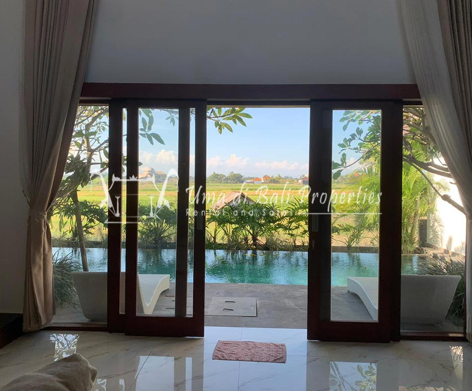 Brand new 3 bedroom villa situated in the nice and quiet area of Umalas is now available for yearly rental. The villa was built on 300 sqm of land size. The villa consists of 3 en-suite bedrooms, an open plan kitchen with closed living space, pool, and parking area.