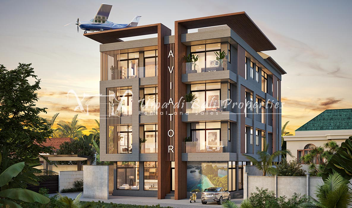 views outside the window. It is being built as a capital building, free of the traditional Indonesian accommodation disadvantages. It will be a pleasure to stay in any weather, now or ten years from now. The hotel is being built in a residential area amongst completed low-rise buildings. It’s quiet beneath the windows, with no new construction sites. It’s a 10-minute walk to the ocean, just far enough that you can’t hear the discos anymore.