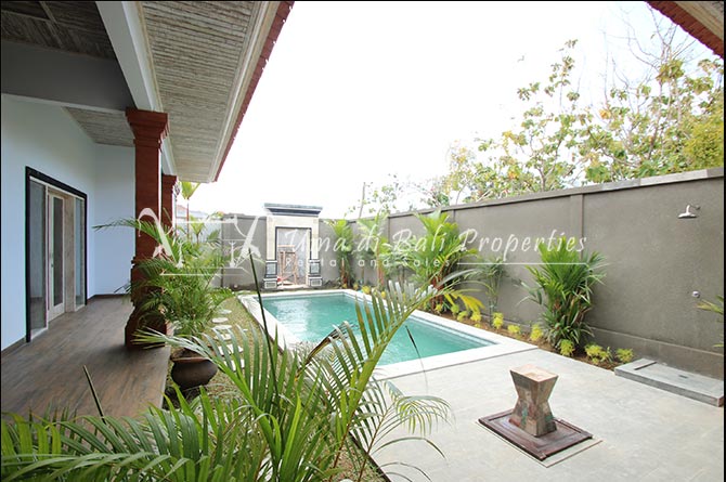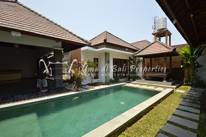 This cozy villa features 2 bedrooms with one nice bathroom that can be accessed from both bedrooms. with a 150sqm land area, this villa is fully furnished, 1 level. Well equipped kitchen and tv & WiFi, electricity 4,400 W, 3×6 mtr swimming pool with a good size of bale next to it. Shared parking lot for cars, Air conditioning in each bedroom, and dining room.