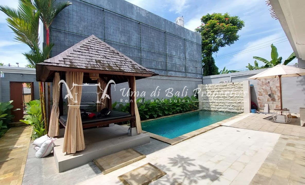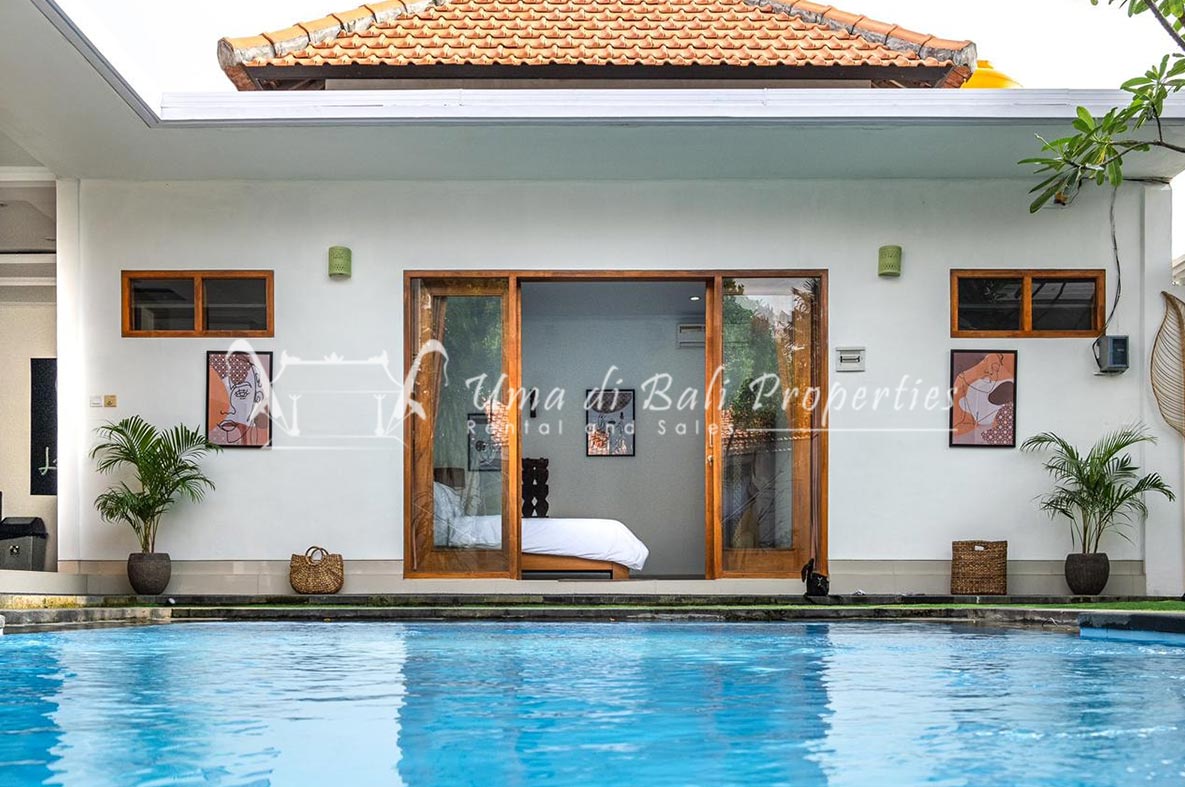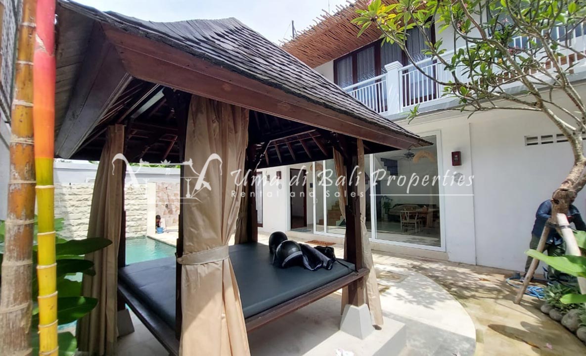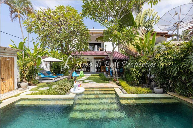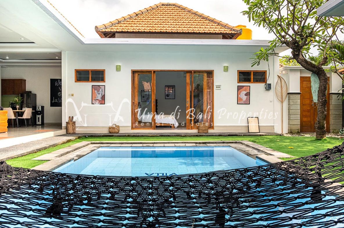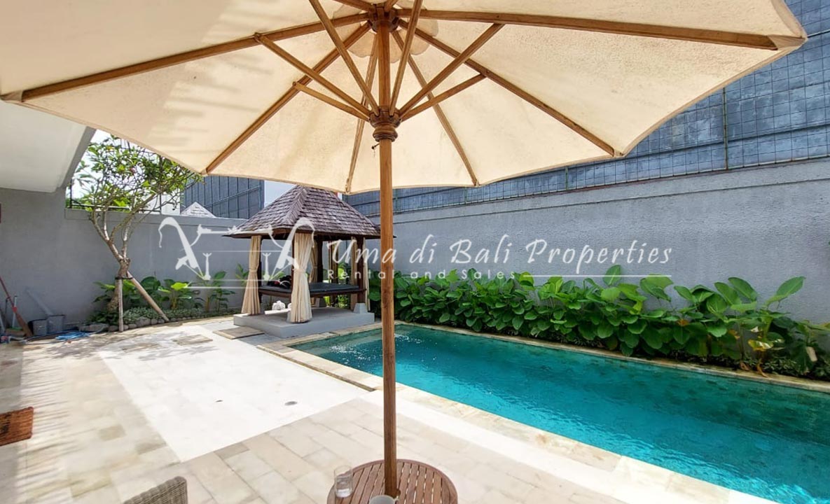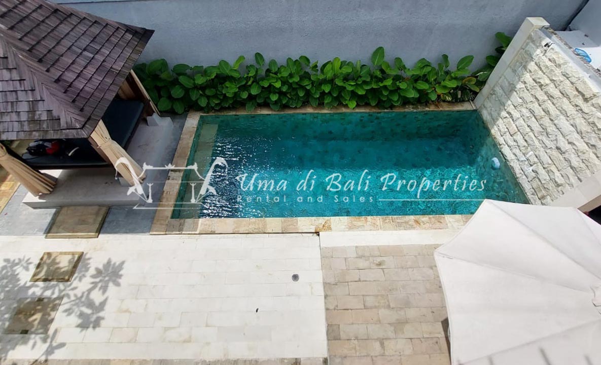 Gorgeous 4 bedroom villa nestled in a lovely neighbourhood of Umalas is available for monthly and yearly rental. The villa set on 400 sqm of land size. Its features 4 en-suite bedrooms, fully equipped kitchen, closed living room, mezzanine can be converted as a guest room or play room, terrace with massage bed, laundry room with guest toilet, pool, garden and private parking.