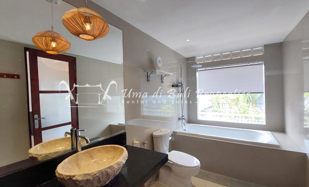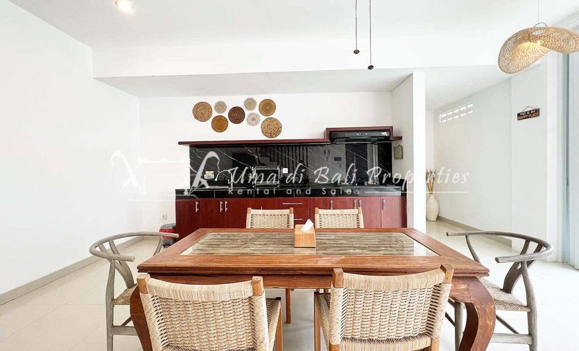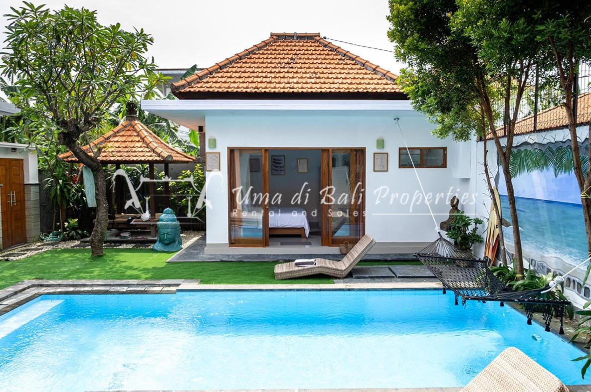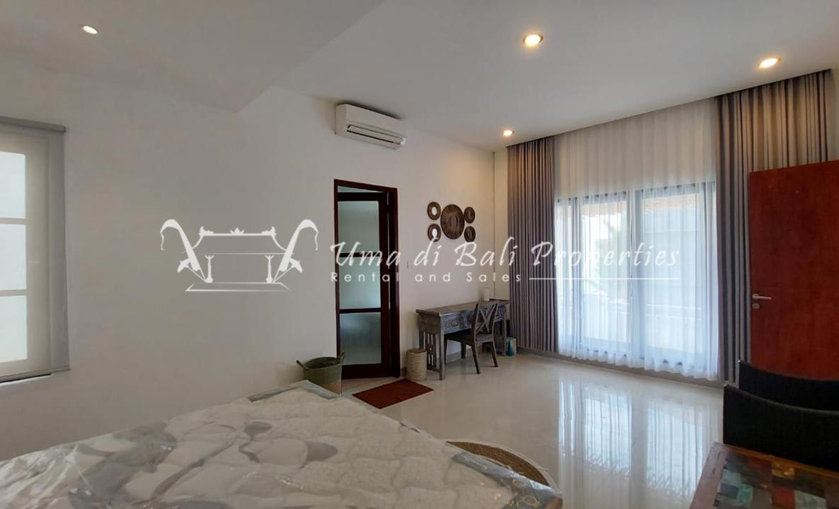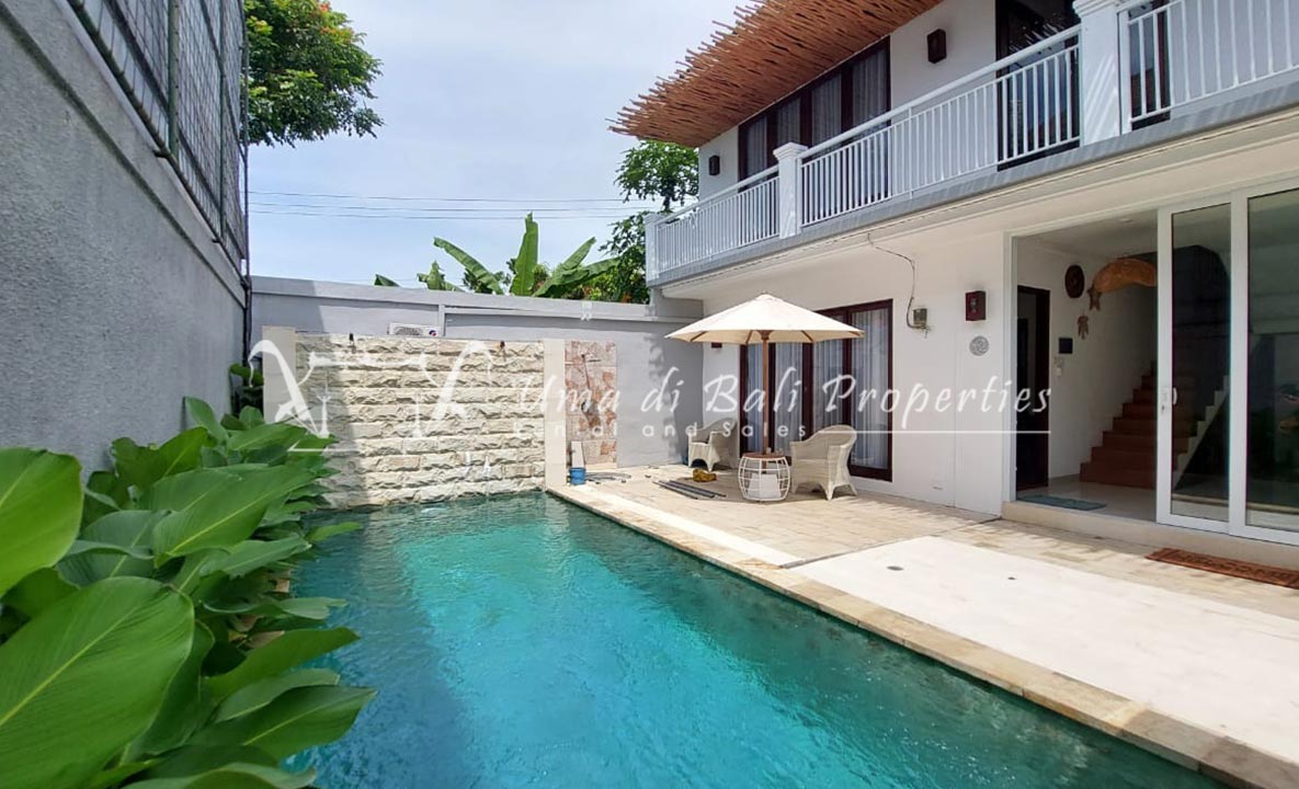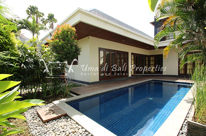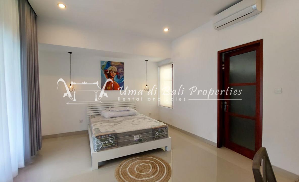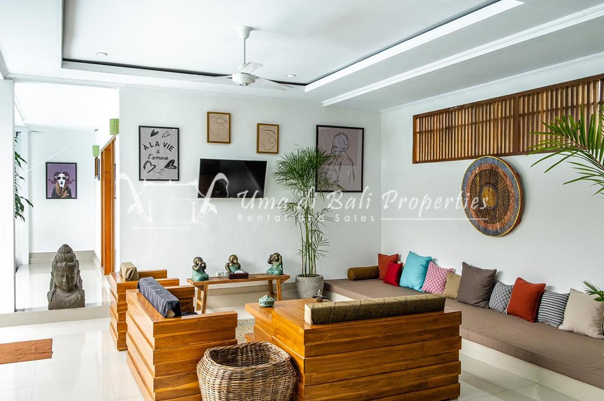 Gorgeous 4 bedroom villa nestled in a lovely neighbourhood of Umalas is available for monthly and yearly rental. The villa set on 400 sqm of land size. Its features 4 en-suite bedrooms, fully equipped kitchen, closed living room, mezzanine can be converted as a guest room or play room, terrace with massage bed, laundry room with guest toilet, pool, garden and private parking.