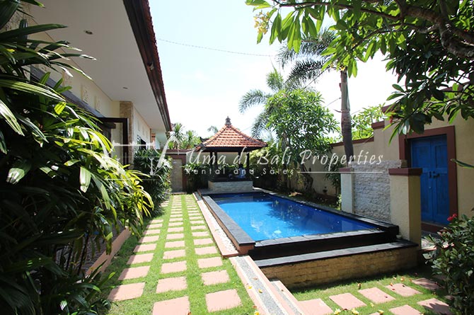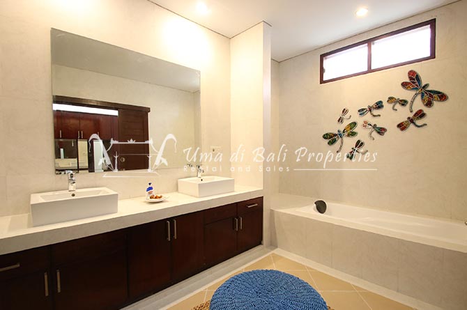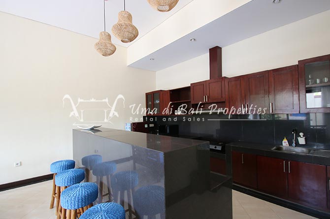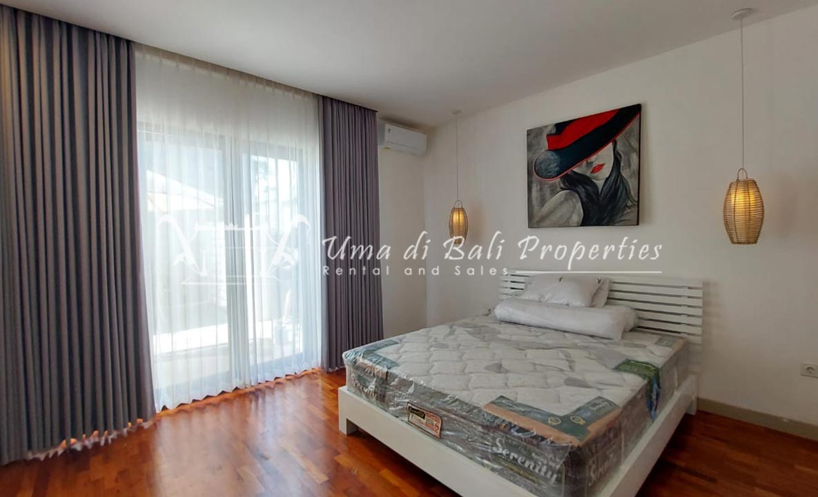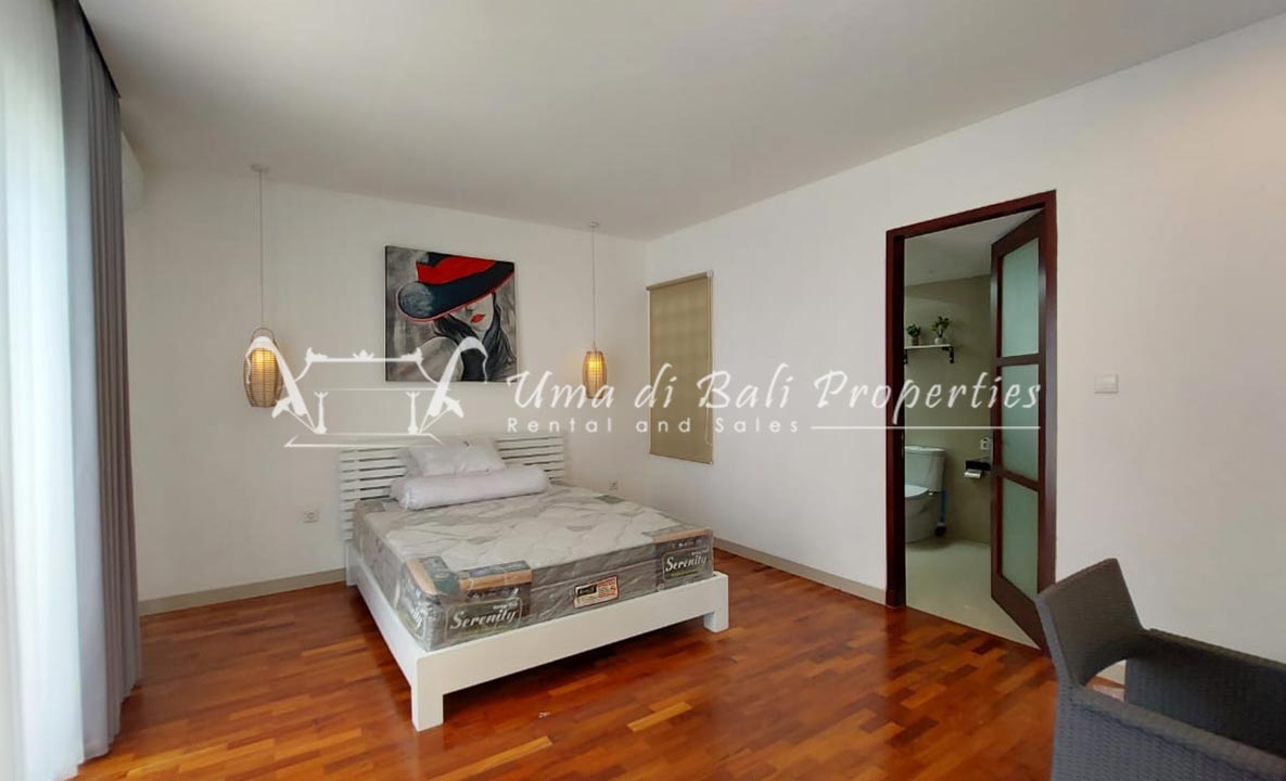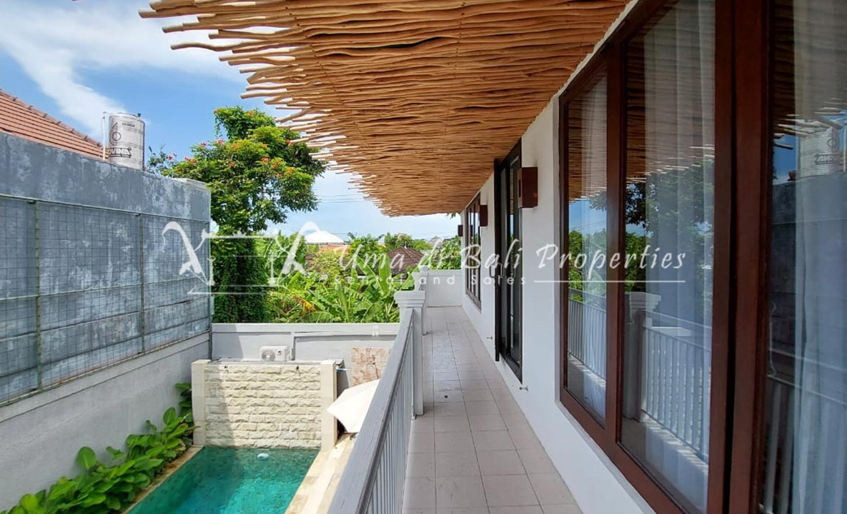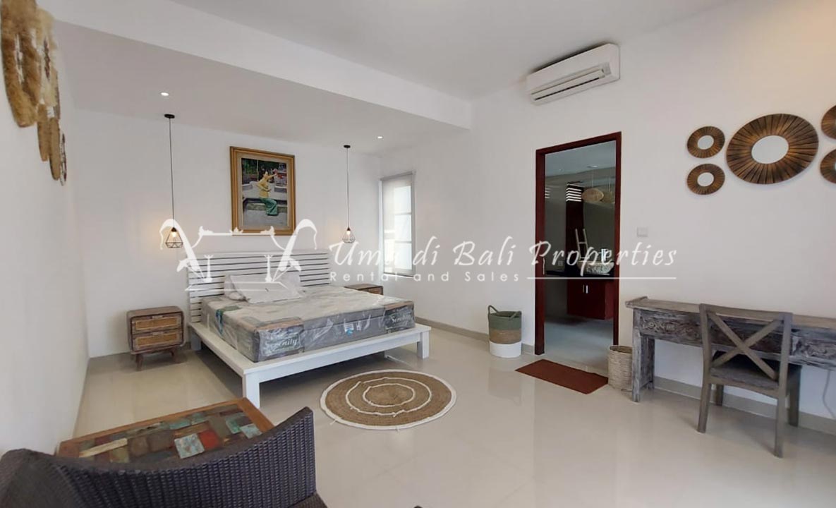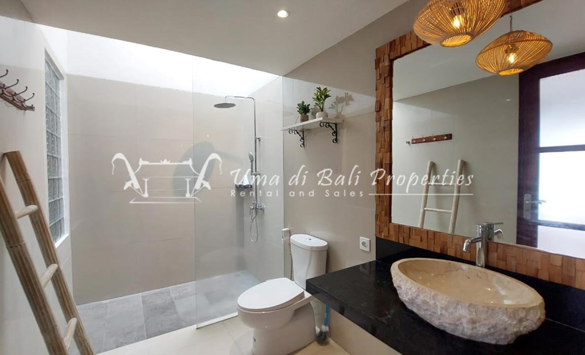 Gorgeous 4 bedroom villa nestled in a lovely neighbourhood of Umalas is available for monthly and yearly rental. The villa set on 400 sqm of land size. Its features 4 en-suite bedrooms, fully equipped kitchen, closed living room, mezzanine can be converted as a guest room or play room, terrace with massage bed, laundry room with guest toilet, pool, garden and private parking.